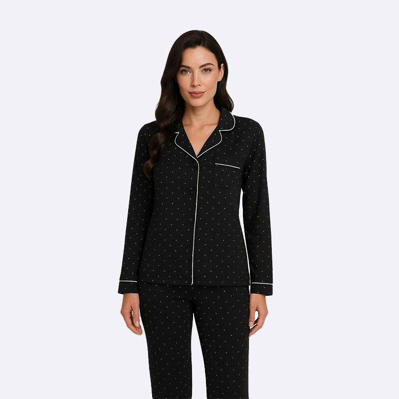 طقم بيجاما مريح بأكمام طويلة وطبعة نقاط (Polka Dot) صغيرة، يتميز بقميص مزود بأزرار وبنطلون طويل، ومزين بحواف متباينة، مثالي للارتداء المنزلي.
