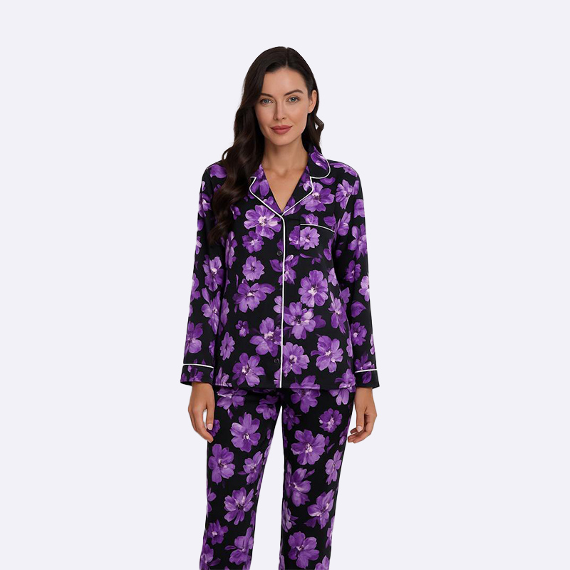 طقم نوم من قطعتين، يتكون من قميص بأكمام طويلة وسروال، مزين بنقوش زهرية ومصنوع من قماش ناعم ومريح.