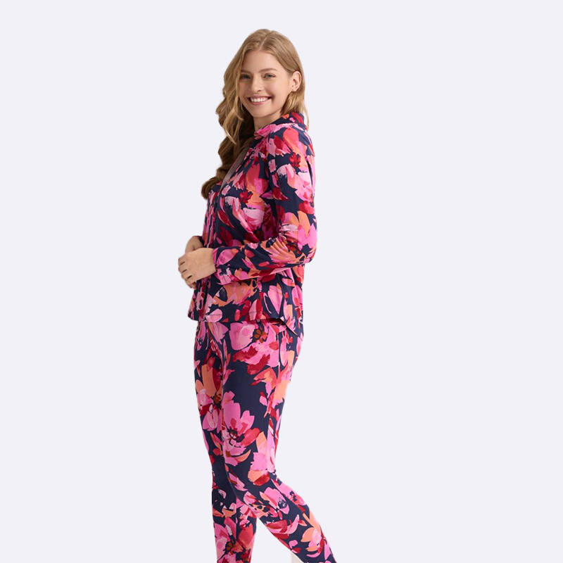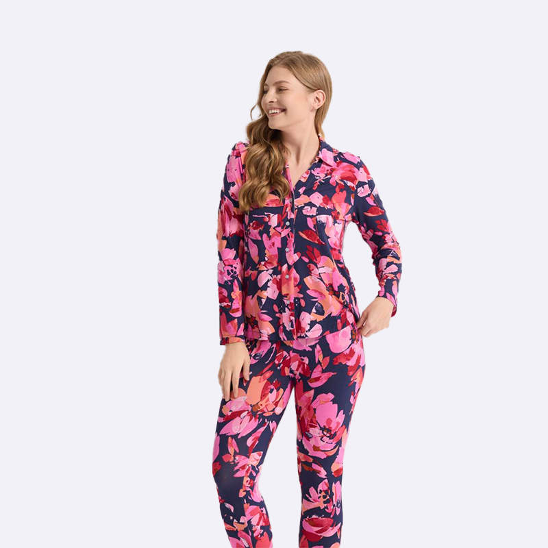 طقم بيجامة بنقشة أزهار كثيفة، مكون من قميص بأكمام طويلة وأزرار أمامية وياقة مطوية، وبنطال طويل بقصة مستقيمة. يوفر راحة مثالية لإطلالة مريحة أثناء النوم أو في المنزل.