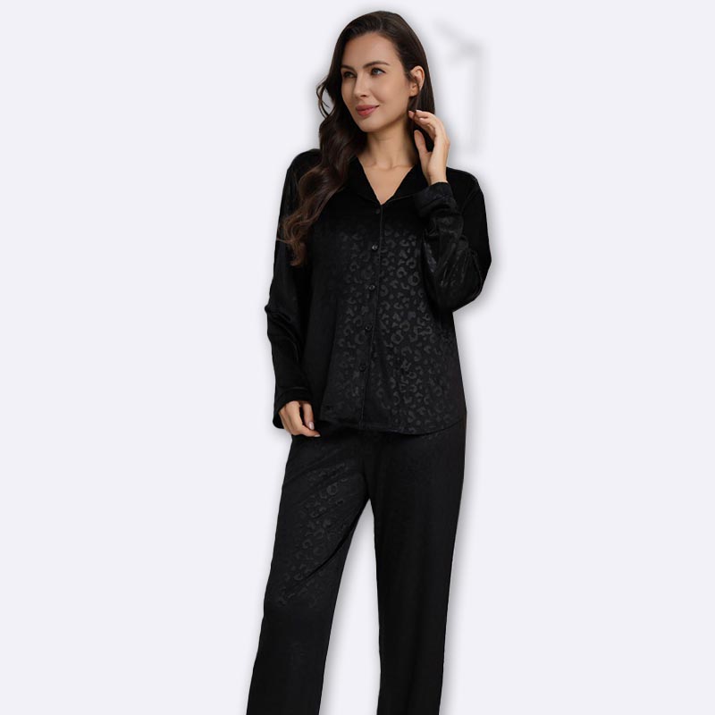 استمتعي بنوم هانئ وأنتِ في قمة الأناقة مع طقم البيجامة المخملي الأسود. تصميم فاخر ومريح يمنحكِ شعوراً بالدفء والراحة طوال الليل.