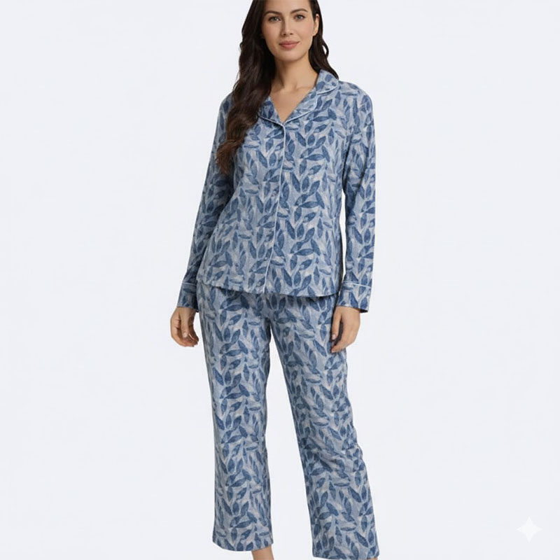 استمتعي بنوم هانئ ومريح مع طقم البيجامة النسائي الأنيق بنقشة أوراق الشجر الزرقاء. مصنوع من أجود الخامات لتوفير أقصى درجات الراحة والأناقة أثناء النوم والاسترخاء.