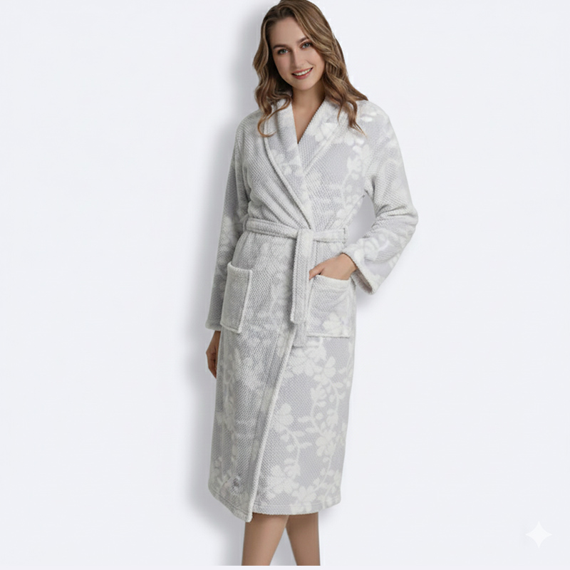 استمتعي بالراحة والأناقة مع هذا الروب النسائي المخملي بنقشة الزهور. مثالي للاسترخاء في المنزل أو بعد الاستحمام، يمنحك شعوراً بالدفء والنعومة.