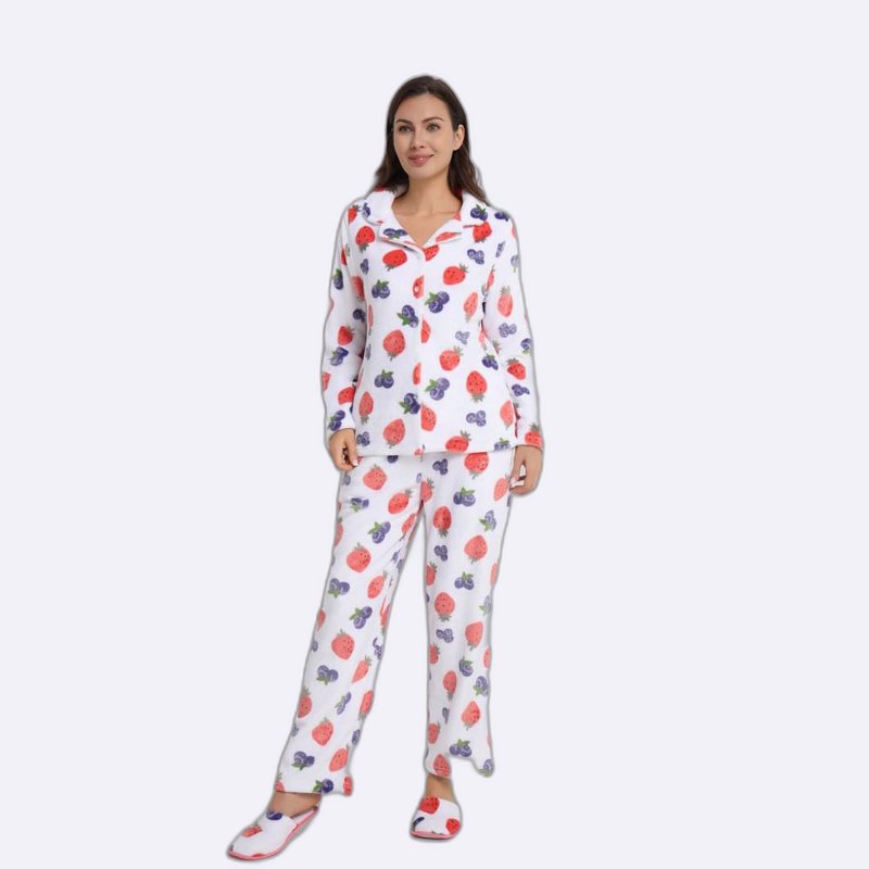 استمتعي بأحلام سعيدة مع طقم البيجامة والروب المريح بنقشة التوت اللطيفة. مصنوع من أجود الخامات لتوفير أقصى درجات الراحة والاسترخاء.