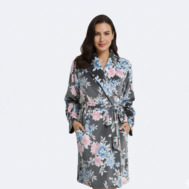 استمتعي بالراحة والأناقة مع هذا الروب الفاخر بنقشة الزهور. مصنوع من الفرو الناعم ليمنحك الدفء والاسترخاء بعد يوم طويل.