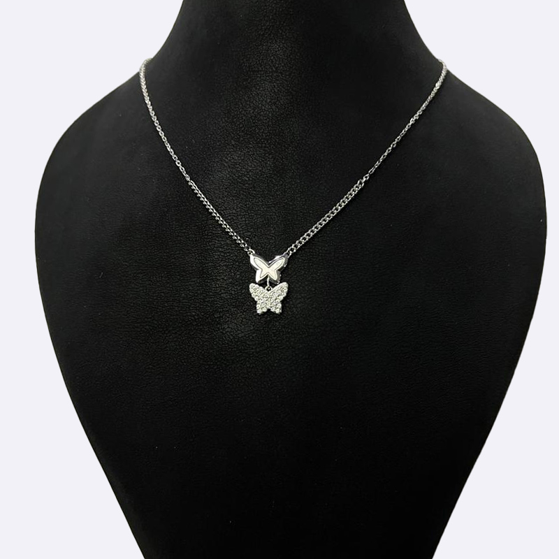 زيني عنقك بجمال الفراشات مع هذا العقد الفضي الأنيق. تصميم فريد يضفي لمسة من الرقة والجمال على إطلالتك.