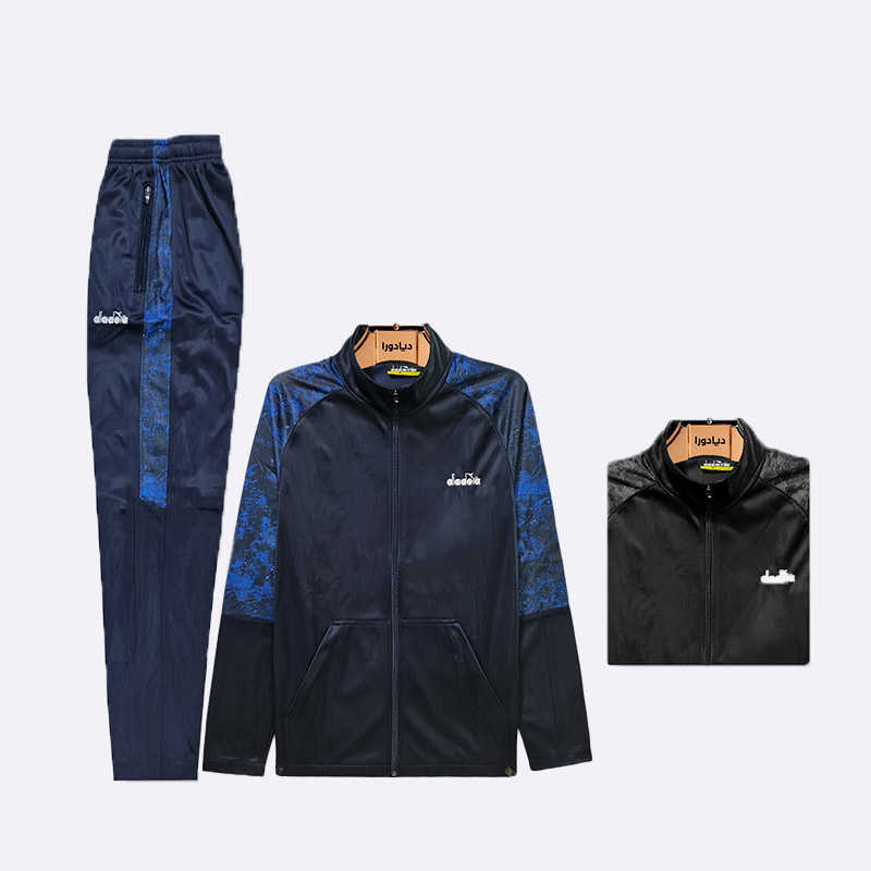 طقم رياضي رجالي مكون من قطعتين. جاكيت باللون الأسود مع أكمام عليها طبعات باللون الأزرق الداكن، وبنطال باللون الأزرق الداكن مع خطوط جانبية مزخرفة باللون الأزرق. يوجد طقم إضافي باللون الأسود مع أكمام رمادية مزخرفة