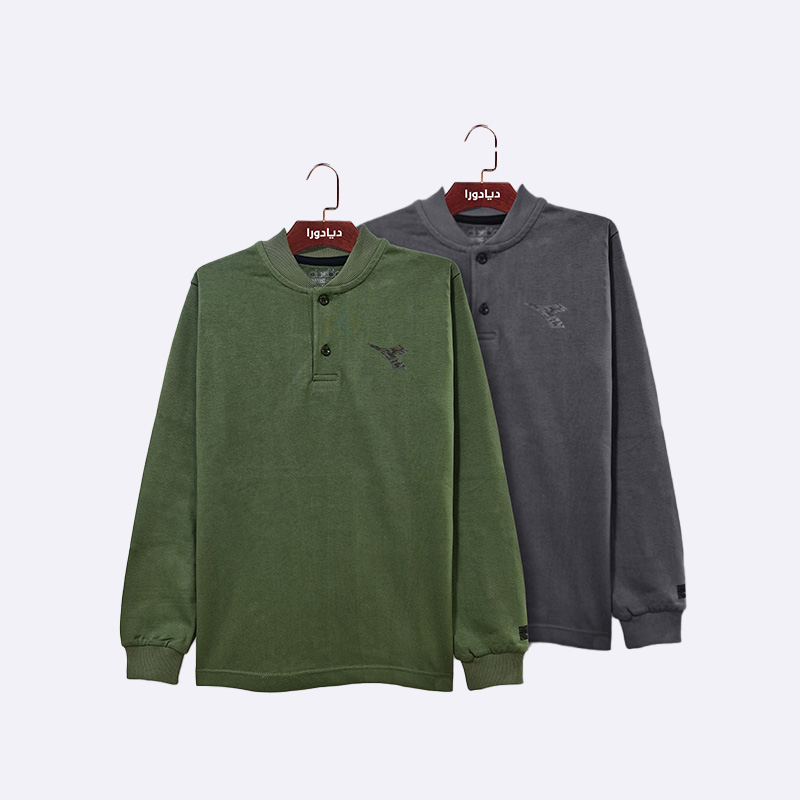 كنزة بولو بأكمام طويلة متوفرة بلونين: أخضر ورمادي غامق. تتميز بياقة مع أزرار وشعار العلامة التجارية المطرز على الصدر.