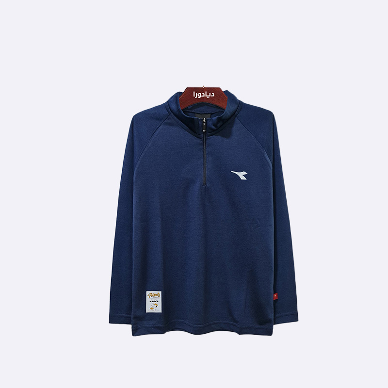 كنزة رياضية للأولاد باللون الأزرق الداكن. تتميز بياقة عالية مع سحاب قصير وشعار العلامة التجارية باللون الأبيض على الصدر.