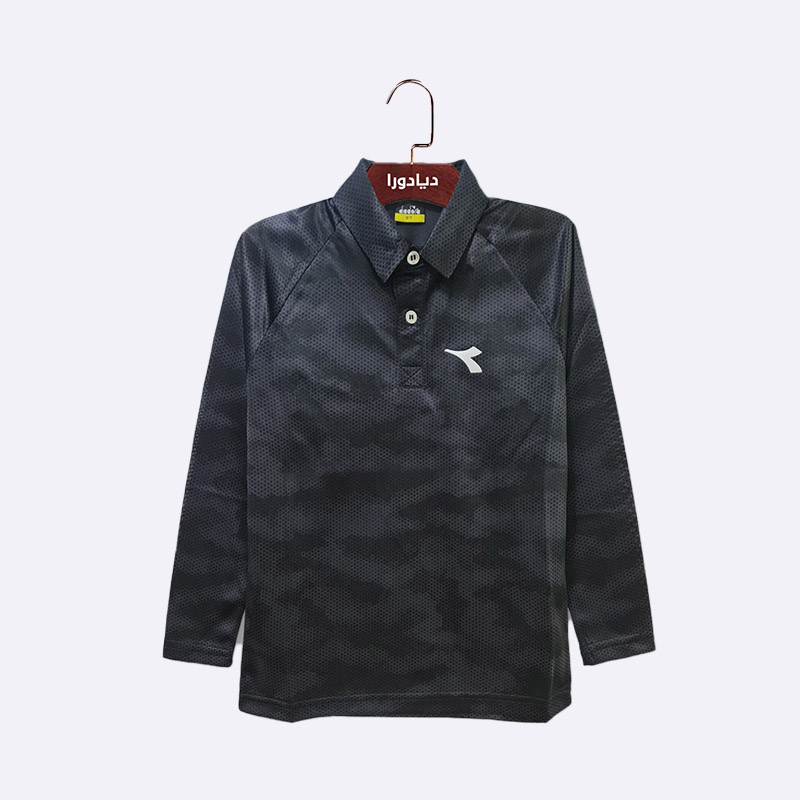 كنزة بولو رجالية باللون الأسود بأكمام طويلة. تتميز بتصميم مموه منقّط مع ياقة وأزرار، وشعار العلامة التجارية باللون الأبيض على الصدر.