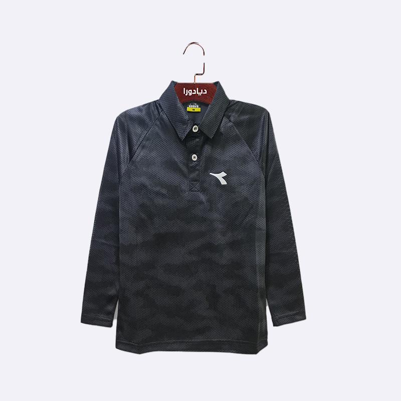كنزة بولو بأكمام طويلة باللون الأسود مع طبعة مموهة. تحتوي على ياقة بأزرار وشعار العلامة التجارية باللون الأبيض على الصدر.