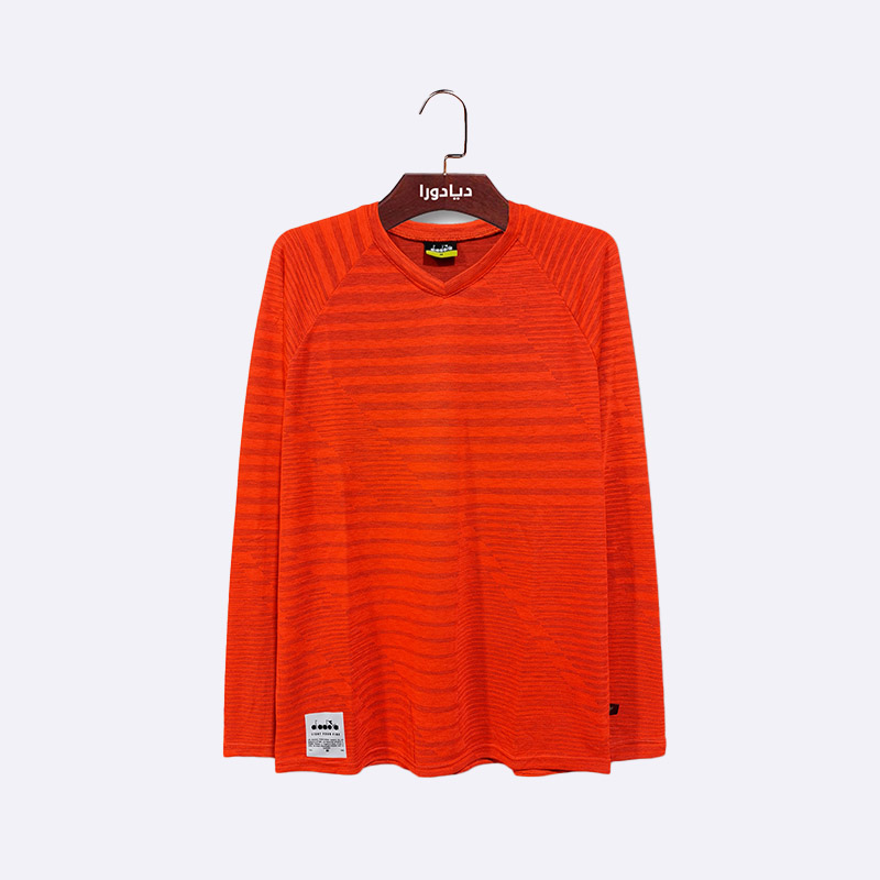 كنزة بأكمام طويلة وقبة على شكل حرف V باللون البرتقالي. تتميز بنسيج مخطط باللونين البرتقالي والأحمر، وأكمام من نوع راغلان.