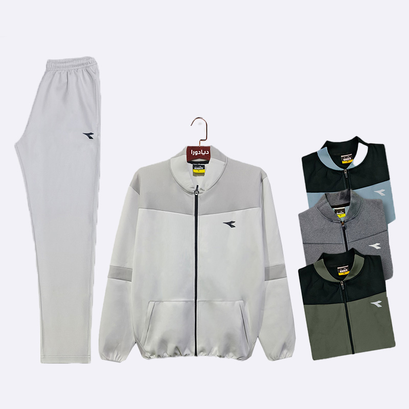 طقم رياضي رجالي مكون من قطعتين. الجاكيت يتميز بتصميم منقسم إلى لونين، والبنطال بلون واحد
