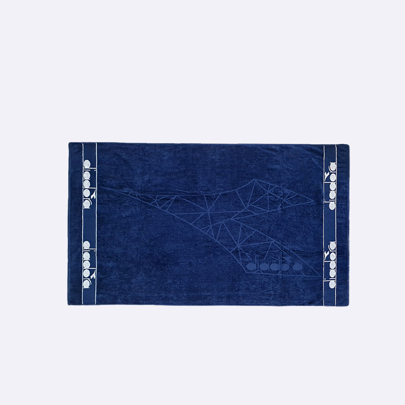 منشفة سباحة باللون الأزرق الداكن مع تصميم خطي أبيض يمثل شعار العلامة التجارية، بالإضافة إلى زخارف بيضاء على الحواف الجانبية.