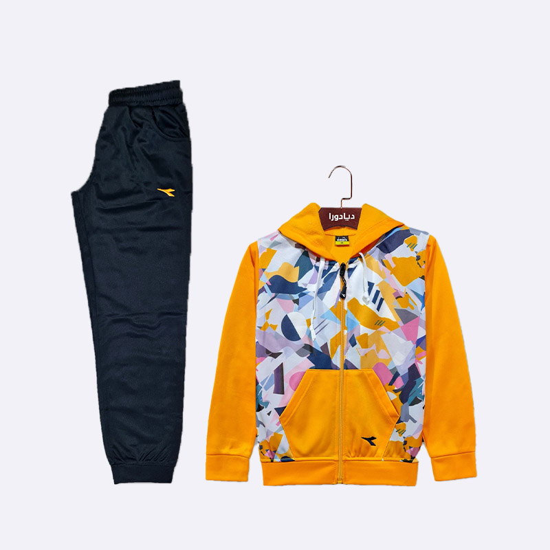 طقم رياضي للبنات مكون من قطعتين. جاكيت باللون الأصفر مع غطاء للرأس وسحاب أمامي، ويتميز بنمط مجرد من الألوان على الصدر والظهر، بالإضافة إلى بنطال رياضي باللون الأسود