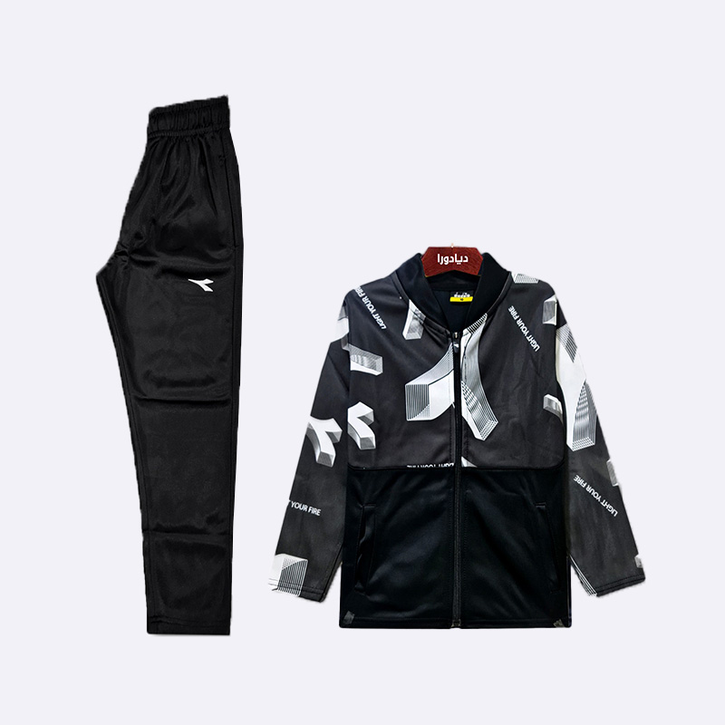 طقم رياضي ولادي مكون من قطعتين. الجاكيت باللون الأسود مع أجزاء علوية بتصميم رسومي باللونين الأسود والأبيض، بالإضافة إلى كتابة باللون الأبيض على الأكمام. البنطال باللون الأسود بخصر مطاطي.