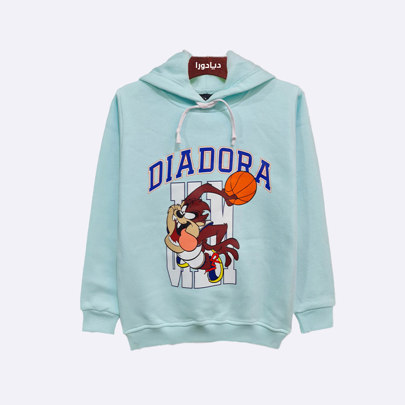 كنزة بغطاء رأس للأولاد باللون الأزرق الفاتح. تتميز بطبعة شخصية كرتونية تحمل كرة سلة، مع شعار "DIADORA" مطبوع عليها. مصنوعة من قماش دافئ ومريح، وهي مثالية للاستخدام اليومي في الأجواء الباردة.