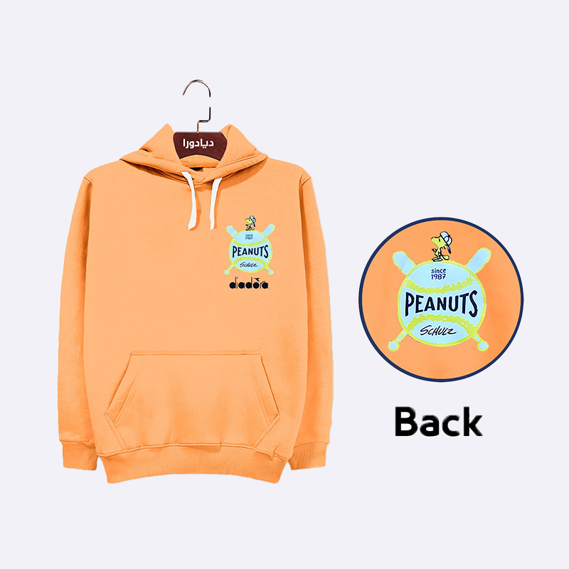 هودي عصري باللون البرتقالي الفاتح، يتميز بتصميم فريد يجمع بين الأمام والخلف. من الأمام، يوجد شعار صغير يظهر شخصية "Woodstock" من سلسلة "Peanuts" الشهيرة، ومن الخلف،