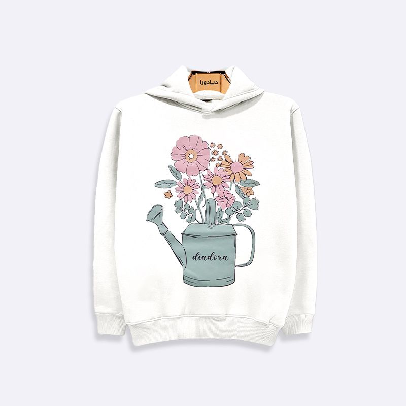 هودي (سويت شيرت بغطاء رأس) باللون الأبيض أو الكريمي، يتميز بطبعة فنية جميلة لزهور ملونة داخل مرشة ماء (watering can)، مع شعار "diadora" مطبوع على المرشة. تصميم الهودي بسيط ومريح، ويحتوي على جيب أمامي، مما يجعله قطعة أنيقة ومثالية للاستخدام اليومي.