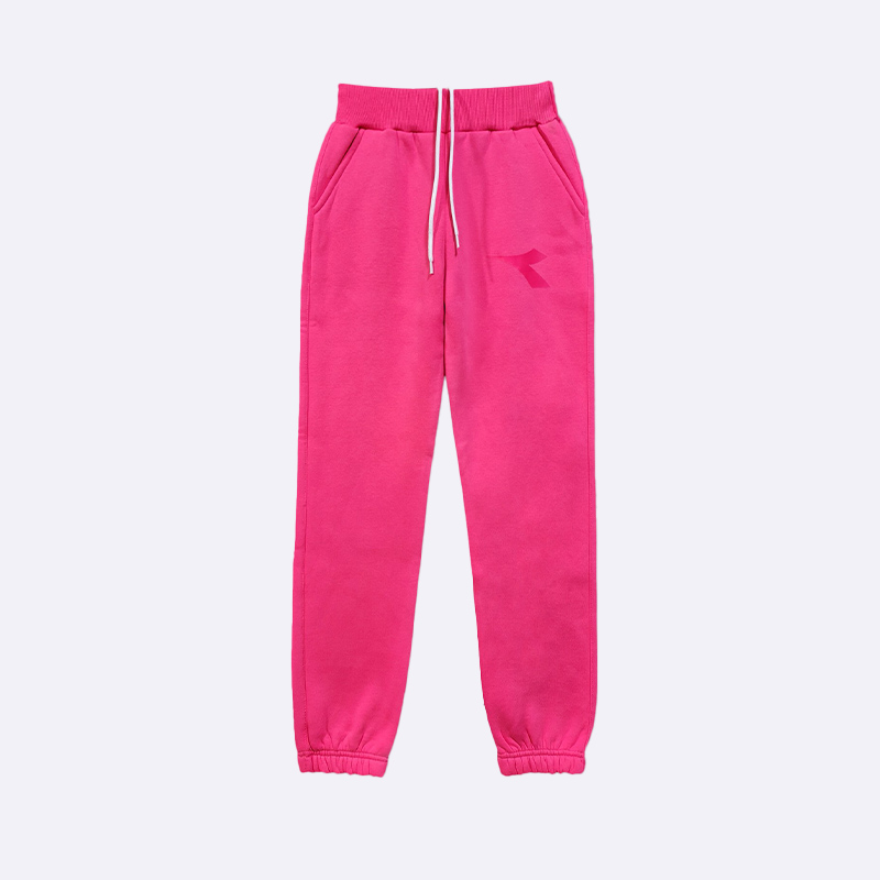 بنطلون رياضي (jogger) للبنات باللون الوردي الزاهي. يتميز بتصميم مريح وعصري، مع خصر مطاطي ورباط أبيض للتحكم في المقاس، وأساور عند الكاحل. مزود بجيبين جانبين وشعار صغير مطبوع على الجهة الأمامية. مثالي للرياضة أو للارتداء اليومي.