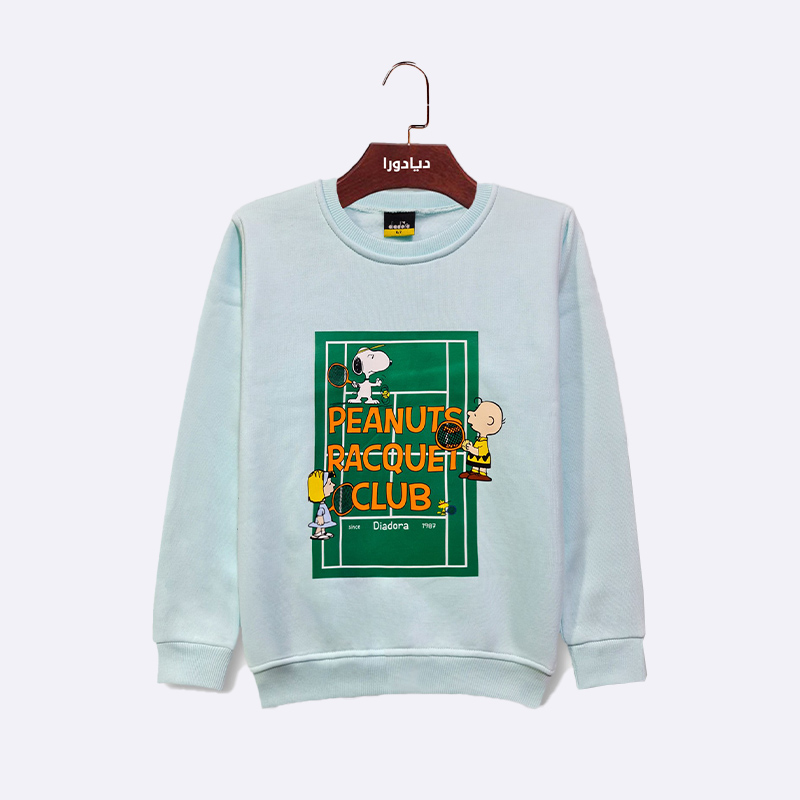 كنزة دائرية الرقبة باللون الأزرق الفاتح للأولاد. تتميز بطباعة كبيرة لشخصيات "Peanuts" الكرتونية (سنوبي وتشارلي براون) على ملعب تنس، مع عبارة "PEANUTS RACQUET CLUB". الكنزة مريحة ومناسبة للارتداء اليومي