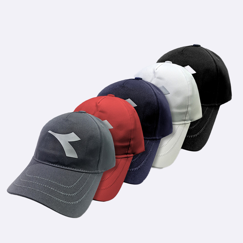 مجموعة من القبعات الرياضية الكلاسيكية (بيسبول)، تتميز بشعار مطبوع على الواجهة الأمامية ودرزات متباينة على الحافة.