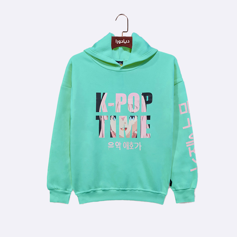 سويت شيرت بناتي دافئ بتصميم واسع (Oversized) وغطاء رأس، يتميز بطبعة جرافيك نصية تحمل عبارة "K-POP TIME" وكتابات أخرى على الصدر والذراع.