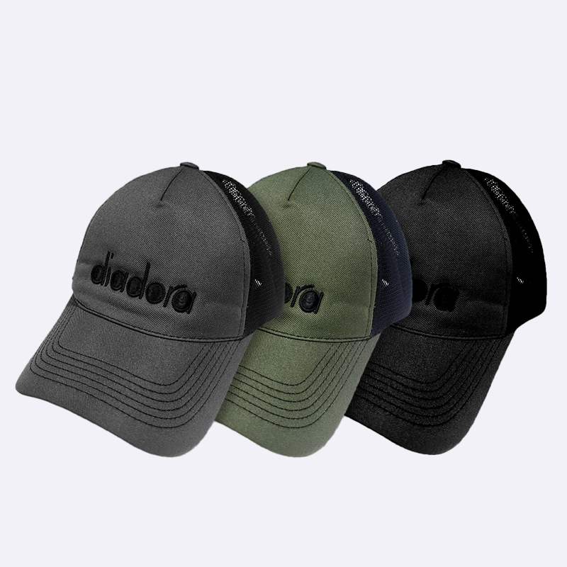 مجموعة من القبعات الشبابية بنمط سائقي الشاحنات، تتميز بتهوية شبكية خلفية وشعار "Diadora" مطرز بخط واضح في الأمام.