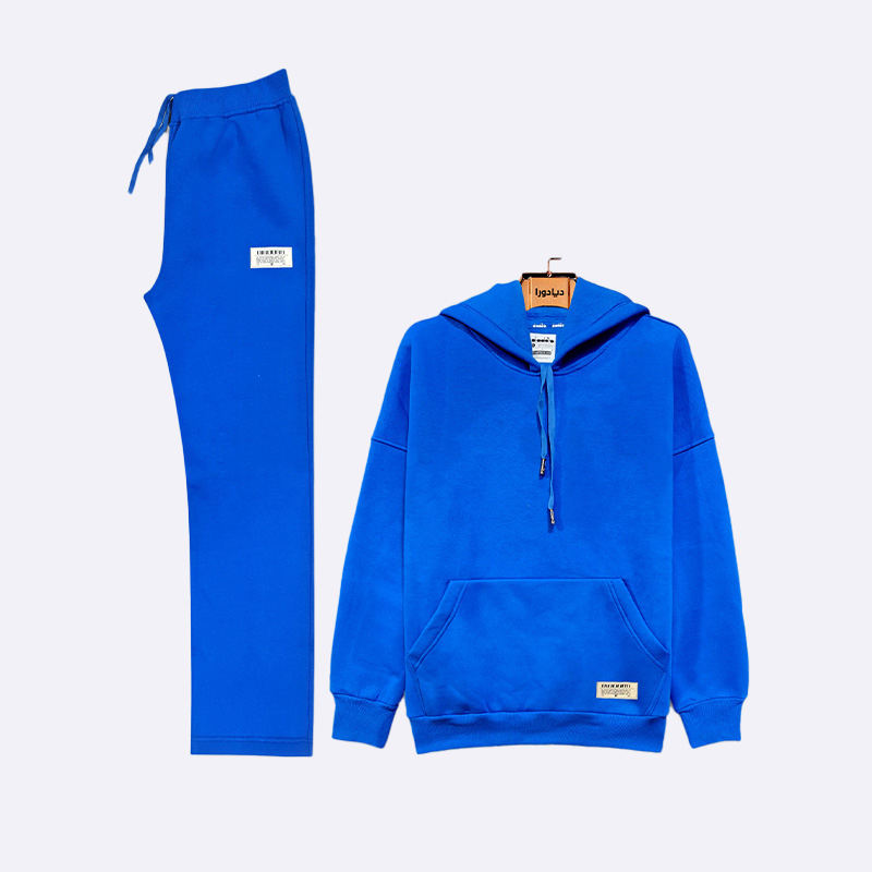 طقم رياضي نسائي مكون من بنطلون وهودي بجيوب، مصمم للراحة والأناقة اليومية.