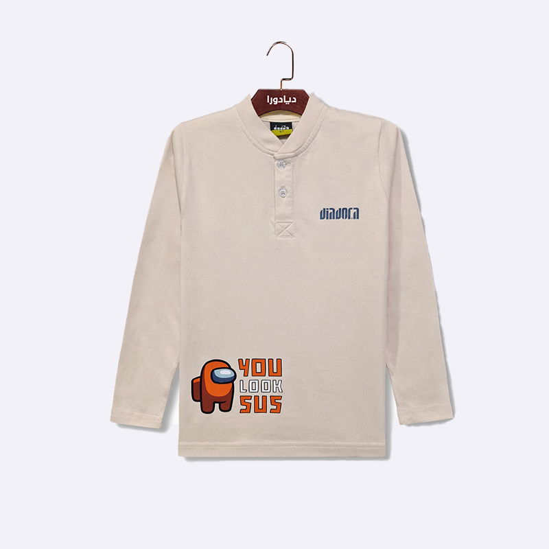 تيشيرت قطني بأكمام طويلة وياقة بفتحة أزرار، يتميز بطبعة رسومية على الصدر.