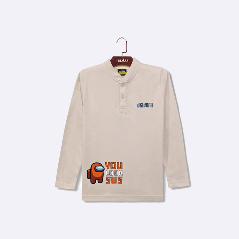 بولو شيرت ولادي بأكمام طويلة وياقة مرتفعة بفتحة أزرار (Henley Neck). يتميز بطبعة شخصية "Among Us" الشهيرة مع عبارة "You Look Sus" في الأسفل، ويحمل شعار DIADORA مطرزاً على الصدر. قميص عصري ومريح للارتداء اليومي.