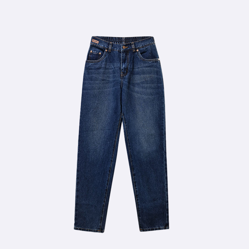 بنطلون جينز ولادي بقصة مستقيمة أو مريحة، بلون أزرق داكن مغسول (Dark Wash)، مزود بخمسة جيوب وحلقات للحزام. قماش دنيم متين ومناسب للارتداء اليومي.