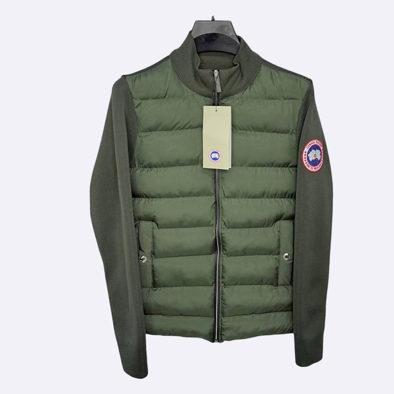 جاكيت يجمع بين نسيج مبطن في الأمام وأكمام محبوكة بسحاب أمامي وشعار دائري على الذراع.