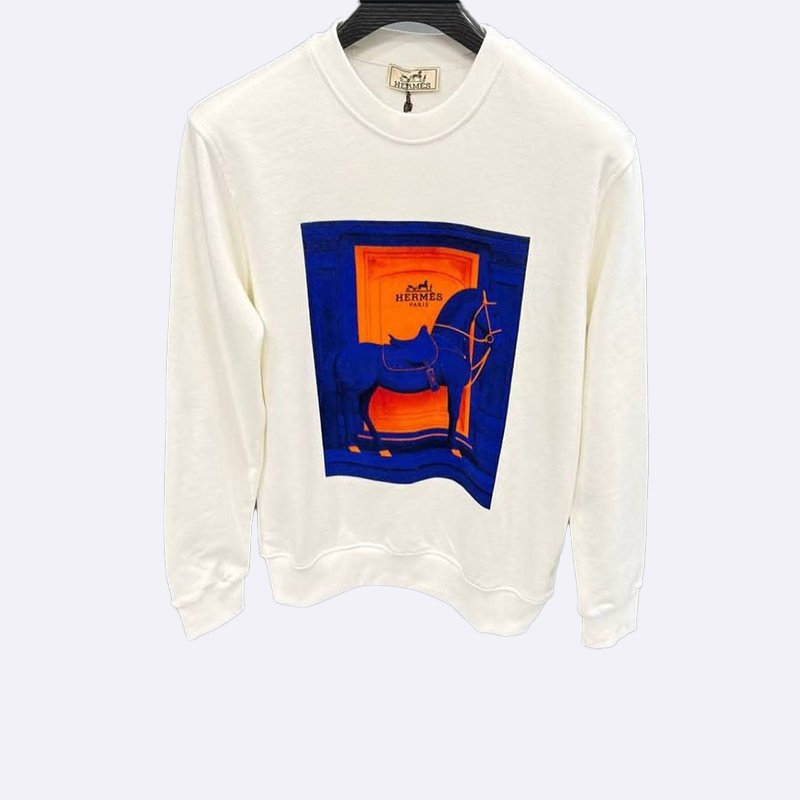كنزة بياقة مستديرة وأكمام طويلة وطبعة رسومية فنية في الأمام.