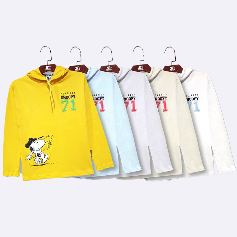 تي شيرت بغطاء رأس مصنوع من القطن، يتميز بطباعة شخصية كرتونية وشقوق جانبية، متوفر بخيارات متعددة، مثالي للارتداء اليومي المريح.