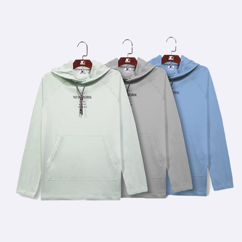 تي شيرت خفيف بأكمام طويلة مصنوع من القطن، يتميز بغطاء رأس وجيب كنغر وطباعة أمامية، متوفر بخيارات متعددة، مثالي للارتداء في الطقس المعتدل.