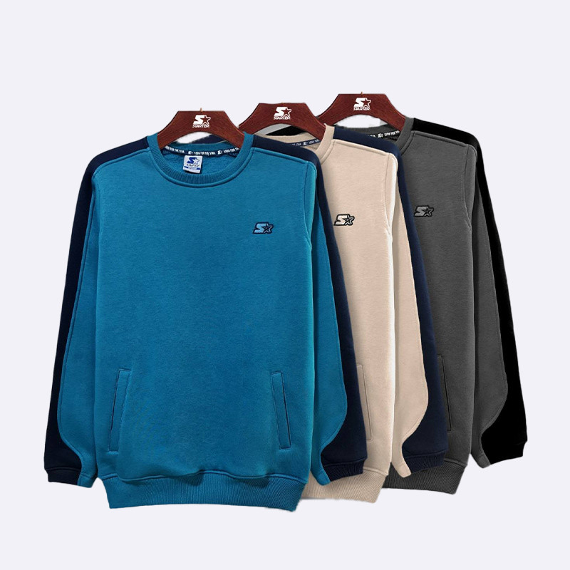 سويت شيرت مريح بأكمام طويلة وياقة دائرية، يتميز بتصميم أنيق ومزيج من الألوان مع جيوب أمامية مخفية وشعار مطرز.