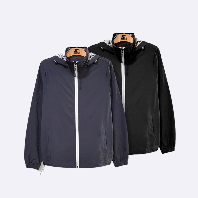 جاكيت رياضي خفيف الوزن ومقاوم للرياح بتصميم كاجوال، يتميز بغطاء رأس (هودي) مبطن بنقشة منقطة، وسحاب أمامي كامل الإغلاق، وأكمام وأطراف سفلية مرنة، مثالي للحماية الخفيفة أثناء الأنشطة الخارجية والتنقل.