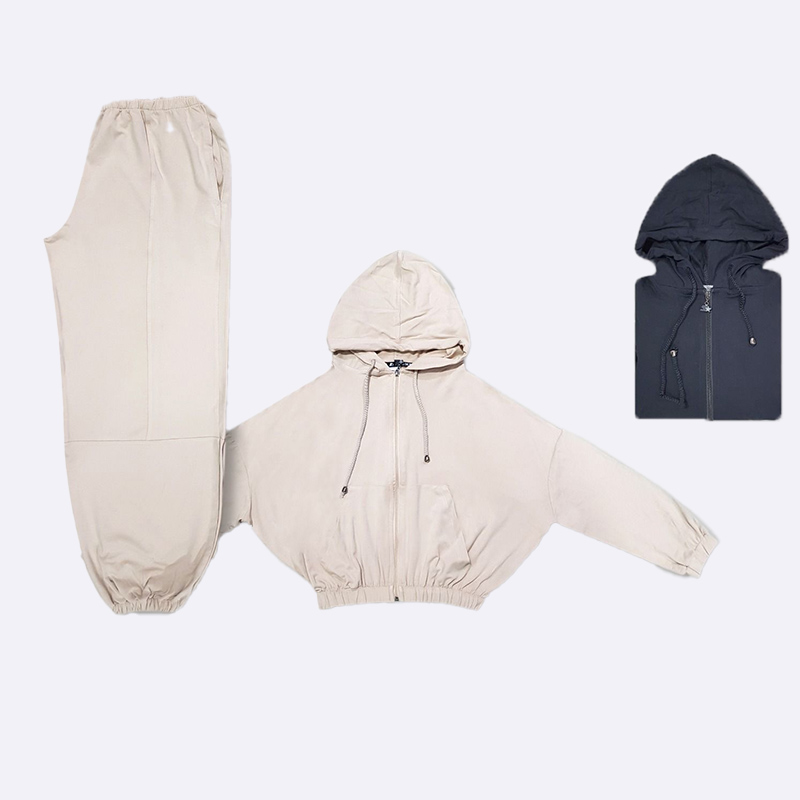 طقم ملابس رياضية مريحة يتألف من جاكيت هودي قصير بسحاب أمامي وقصة واسعة، مزود بغطاء رأس وأربطة، وبنطلون رياضي فضفاض ذو حزام مطاطي وأطراف ضيقة، مثالي لملابس المنزل أو ممارسة الرياضة.