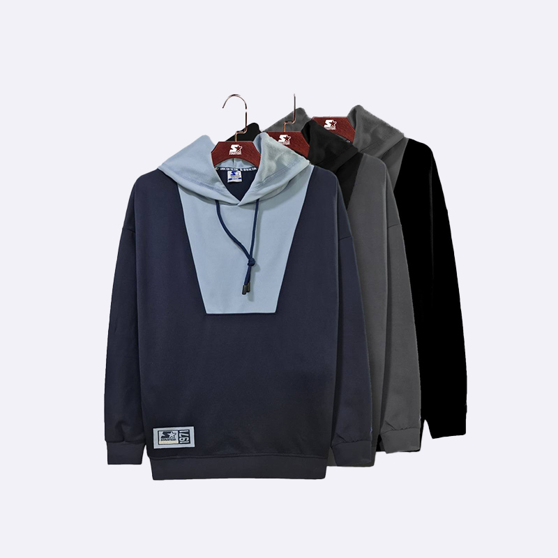كنزة بقلنسوة (هودي) مريحة للرجال، بتصميم عصري ذي أجزاء متباينة في منطقة الياقة والصدر، تتميز بأكمام طويلة وأطراف سفلية بأساور ضيقة، وفتحة رقبة على شكل V مع أربطة، وهي قطعة مثالية للارتداء اليومي غير الرسمي.