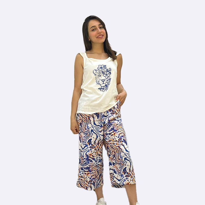 طقم بيجامة نسائي يتكون من بلوزة بدون أكمام مطبوعة برسومات نمر وزهور، مع بنطال واسع بقصة قصيرة (culotte) بتصميم مطبوع وملون. مريح وعصري، مثالي للنوم أو للاسترخاء في المنزل