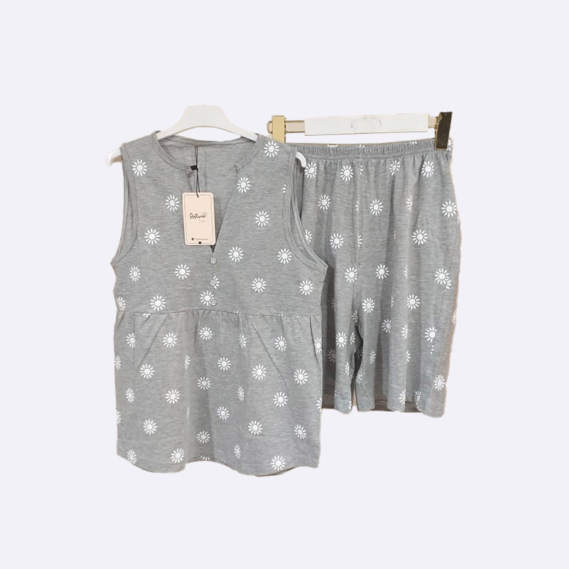 طقم بيجامة نسائي مصنوع من القطن بنسبة 100%، مريح وعصري. يتكون من بلوزة بدون أكمام وياقة دائرية مع فتحة بأزرار، وشورت قصير. يتميز الطقم بنقشة زهور بيضاء على خلفية رمادية، مما يجعله خيارًا مثاليًا للنوم والاسترخاء