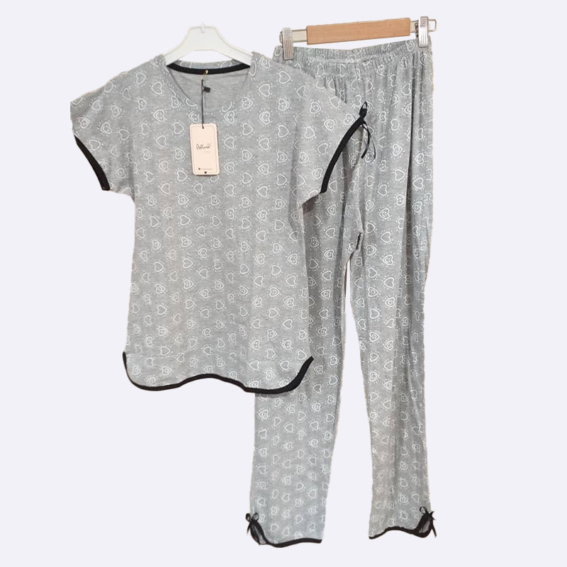 طقم بيجاما نسائي مصنوع من القطن الناعم والمريح. يتكون من تي شيرت بأكمام قصيرة مزين بطبعة قلوب لطيفة، وبنطال طويل بنفس الطبعة. يتميز الطقم بحواف سوداء أنيقة وعقدتين في أسفل البنطال، مما يمنحه لمسة مميزة. مثالي للنوم المريح أو للاسترخاء في المنز