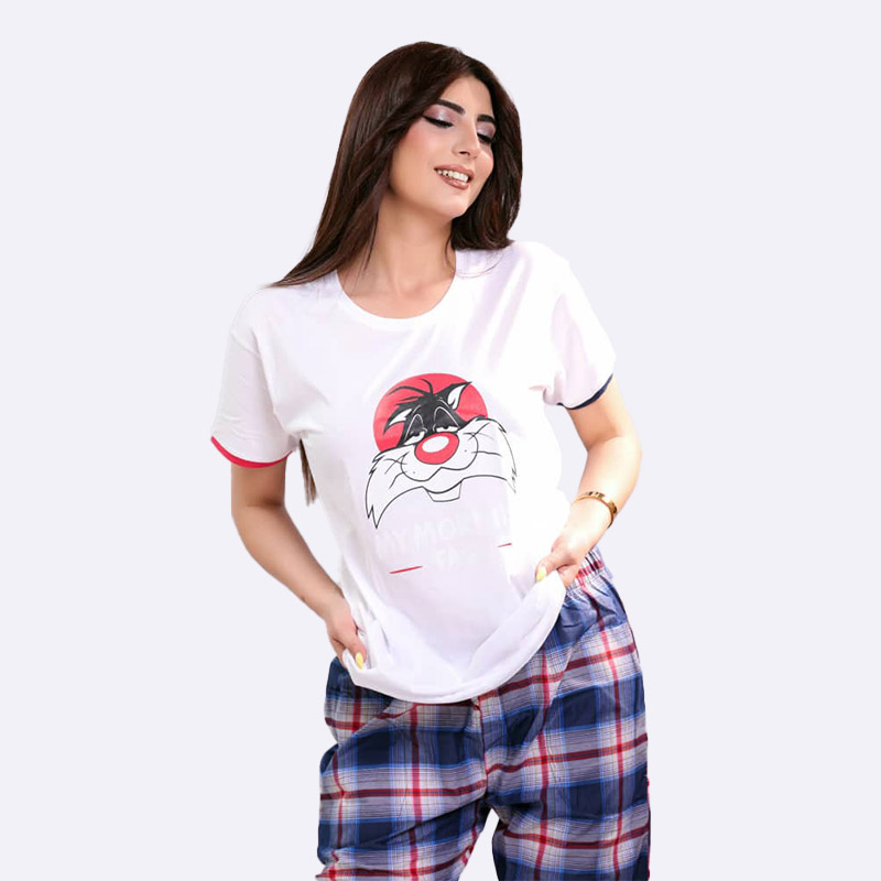 طقم بيجامة نسائي مريح وعصري، يتكون من تي شيرت أبيض بأكمام قصيرة مطبوع عليه رسمة لطيفة، مع بنطال طويل بنقشة كاروهات زرقاء وحمراء. تصميم مثالي للنوم المريح والاسترخاء
