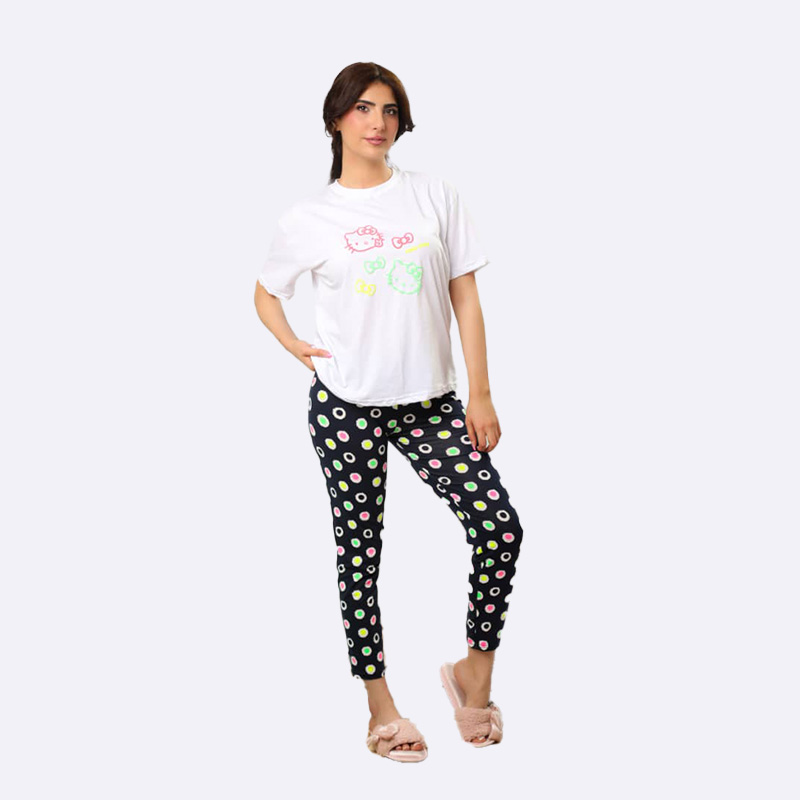طقم بيجاما نسائي مريح يتكون من تي شيرت أبيض بأكمام قصيرة مطبوع عليه شخصية هالو كيتي الملونة، مع بنطال داكن بنقشة دوائر متعددة الألوان. تصميم مرح ومريح مثالي للنوم أو للاسترخاء