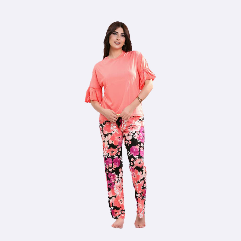 طقم بيجاما نسائي أنيق ومريح، يتكون من بلوزة قصيرة بلون مرجاني بأكمام واسعة مزينة بكشكشة، مع بنطال طويل بنقشة زهور ملونة وجريئة. مثالي للنوم المريح أو للاسترخاء في المنزل