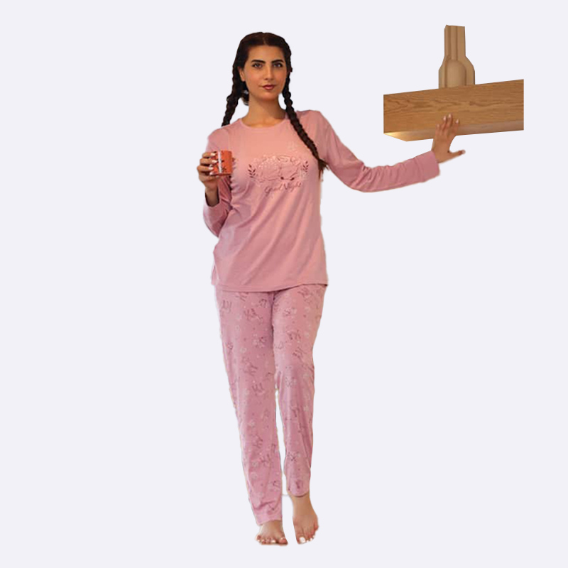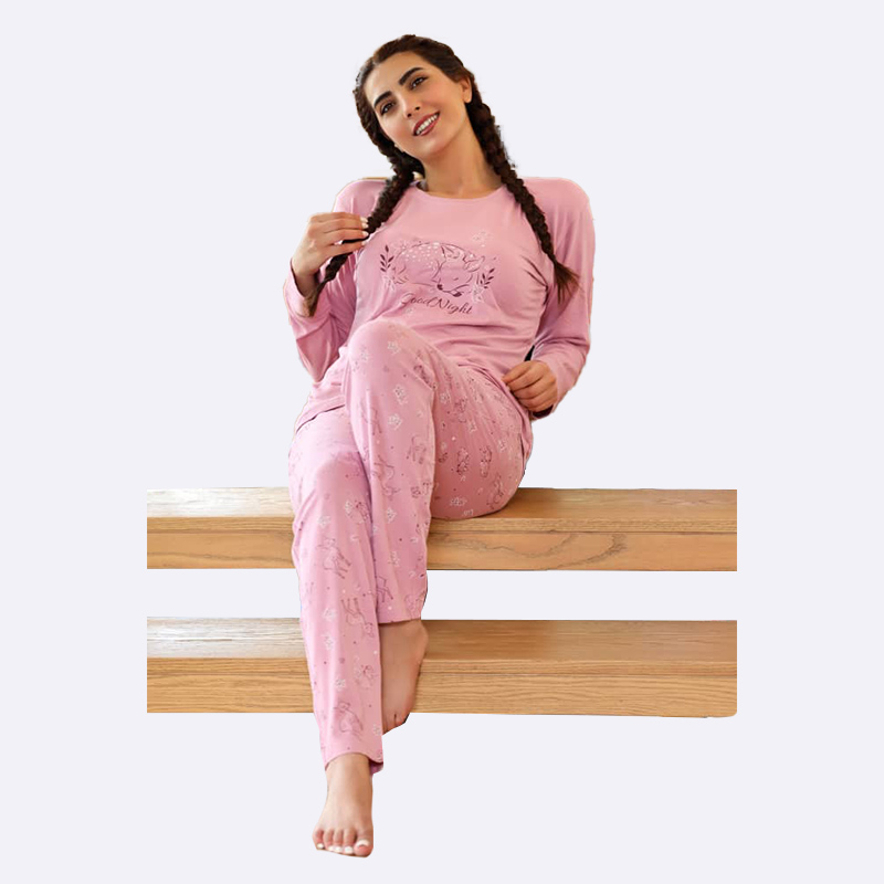 طقم بيجامة مريح بأكمام طويلة وسروال طويل مطبوع بنقوش ناعمة، مصنوع من قماش قطني ناعم ومناسب للارتداء المنزلي.