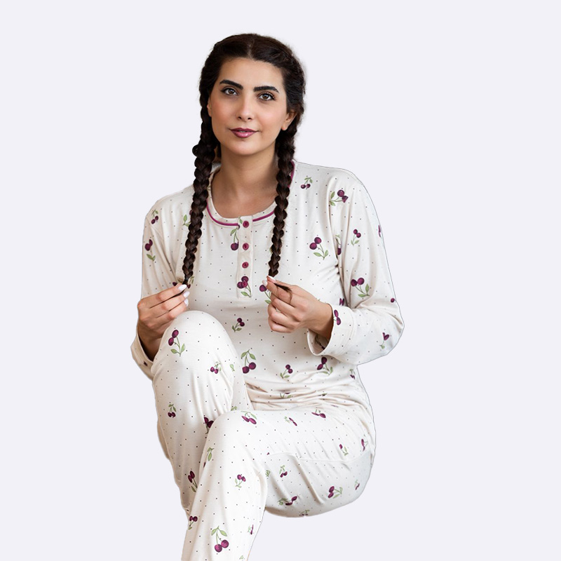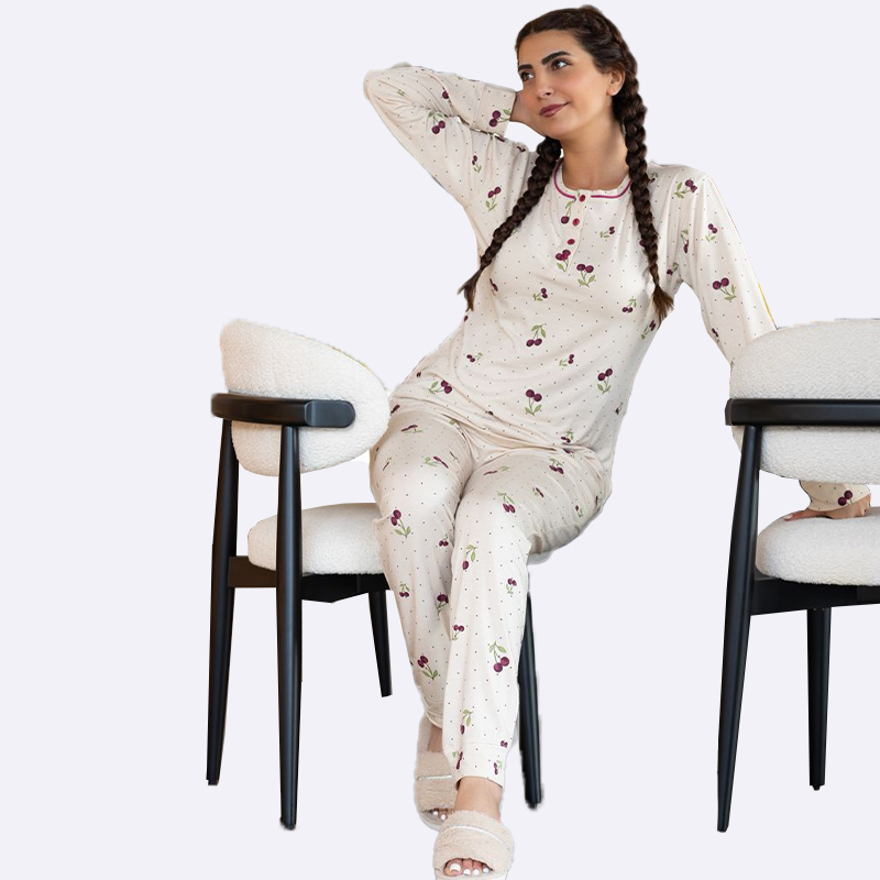 طقم بيجامة مريح بأكمام طويلة وسروال طويل، يتميز بنقشة الكرز المرحة على قماش قطني ناعم ومناسب للارتداء المنزلي.