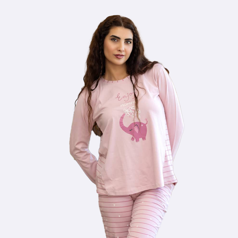 طقم بيجامة قطنية مريحة بأكمام طويلة، يتميز بطبعة فيل جذابة وكتابة، مع سروال مزخرف بخطوط ونقاط للارتداء المنزلي المريح.