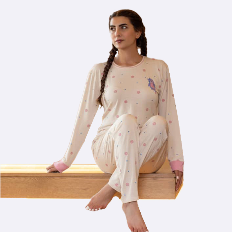طقم بيجامة مريح مصنوع من قماش ناعم، يتميز بتصميم منقط بالكامل مع تطريز صغير على القميص، ومناسب للارتداء المنزلي.