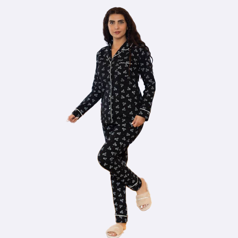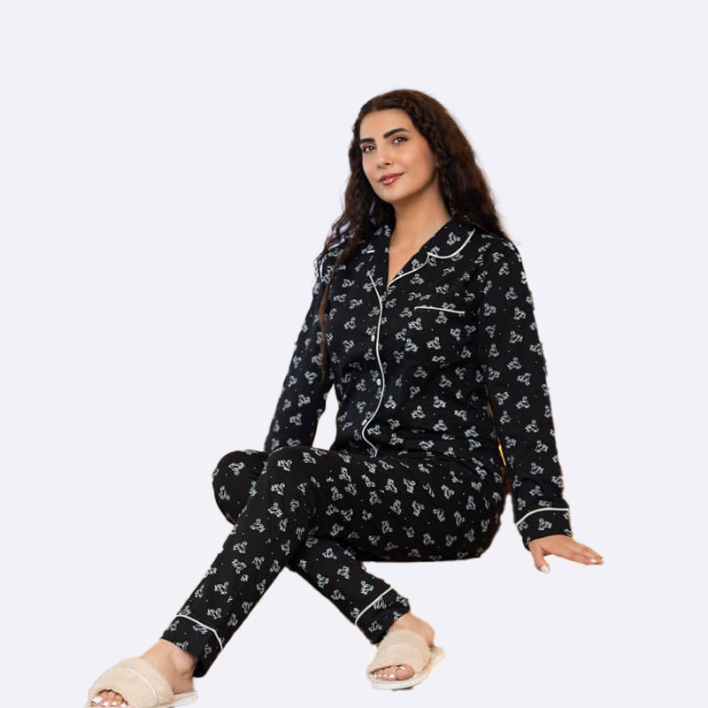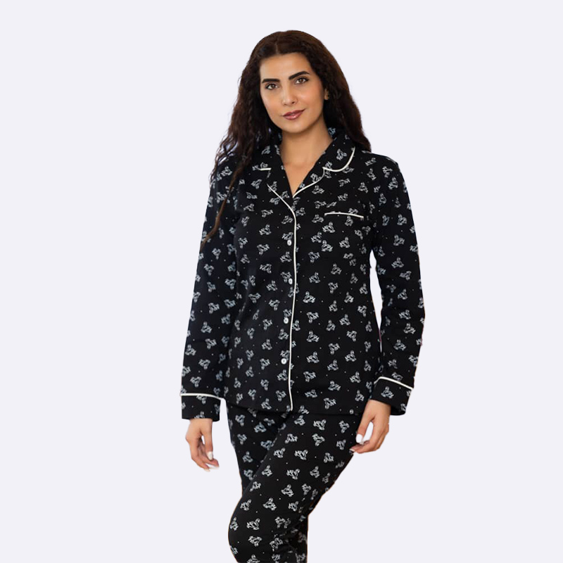 طقم بيجامة تقليدي بياقة وقلنسوة، يتميز بأزرار أمامية ونقشة مطبوعة بالكامل، ومصنوع من قماش ناعم ومريح.